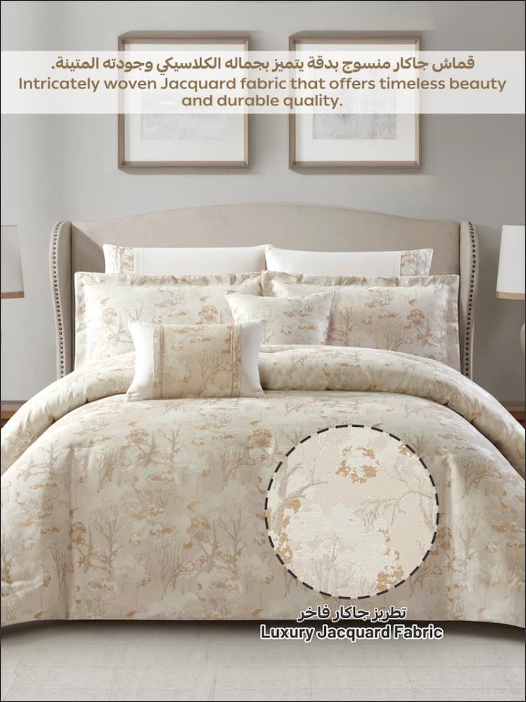 • تصميم جاكار بارز: يتميز المفرش بوجه خارجي من قماش الجاكار الفاخر، بنقوش بارزة متقنة تضفي لمسة فنية على ديكور غرفتك. النقوش ليست مجرد زخارف، بل أعمال فنية تضفي عمقاً وأناقة تدوم.